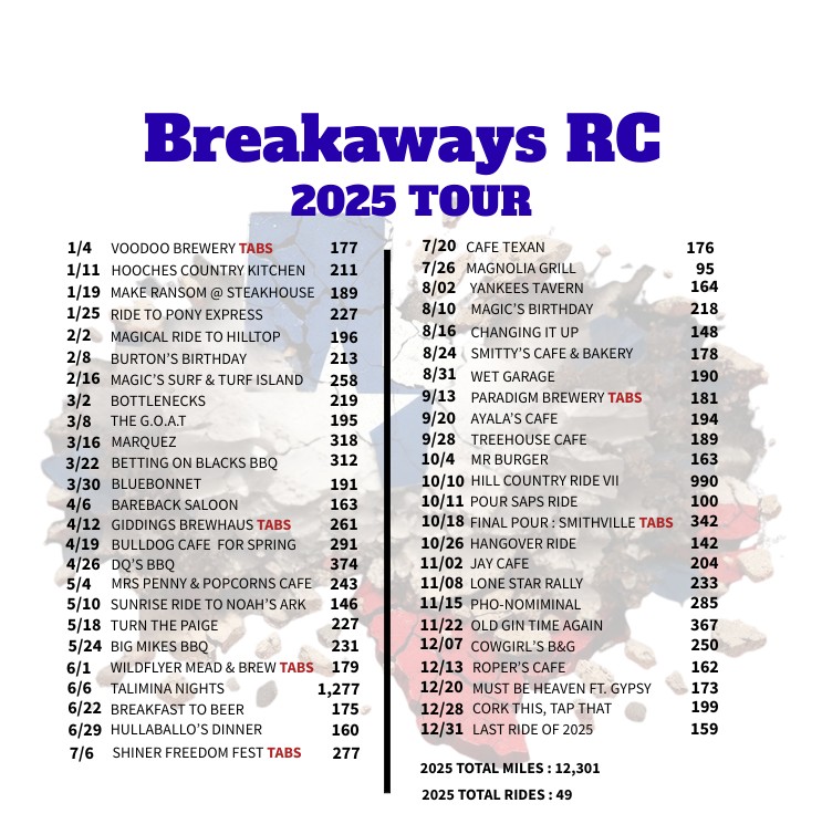 LEARN MORE To see more images from our rides and to see images of our officers and other members out riding and having fun, please visit the Image Gallery. IMAGE GALLERY Interested in riding with the Breakaways Riding Club? Come join us on one of our open public rides. BRC Events BREAKAWAYS RIDING CLUB 2025 TEXAS TOURHow many miles did you ride last year? The Breakaways Riding Club rode 12,301 miles on 49 rides...all over the state of Texas and Arkansas.